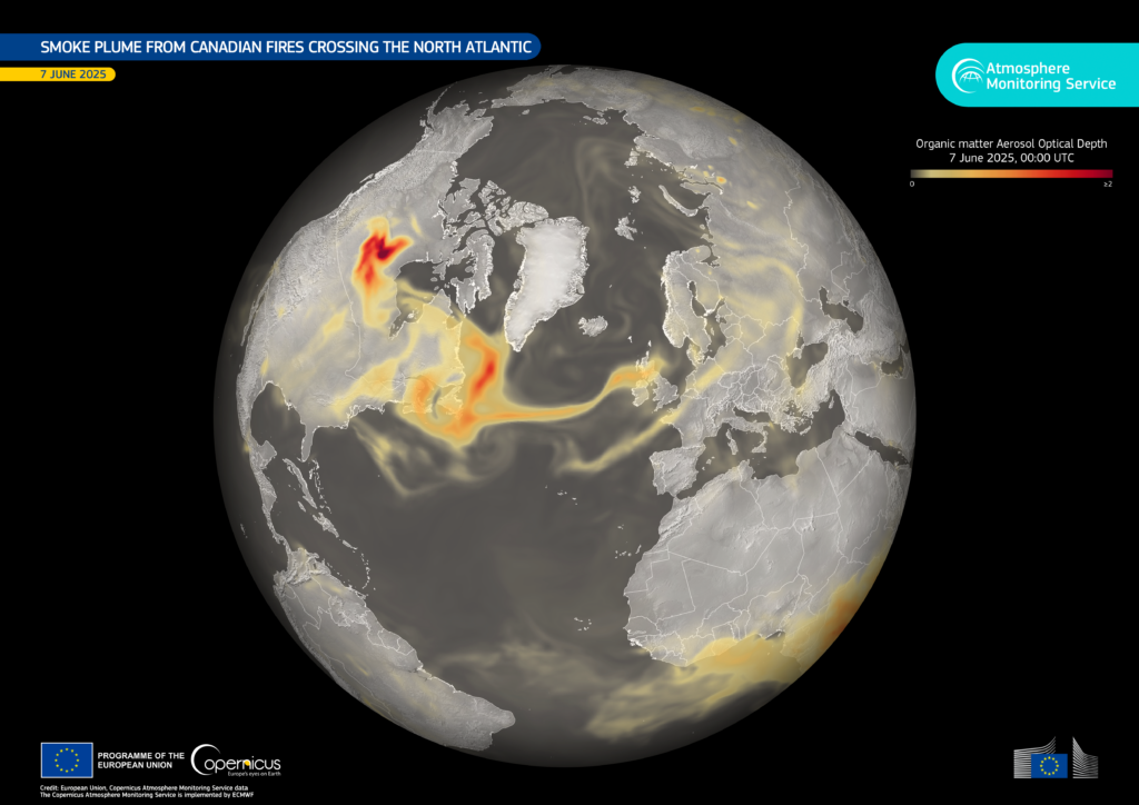Cette visualisation de données, basée sur les données du service de surveillance de l’atmosphère Copernicus (CAMS) , montre les panaches de fumée traversant l’Atlantique et atteignant l’Europe le 7 juin 2025 à 00h00 UTC. Selon CAMS , le Canada a connu une forte activité de feux de forêt en juin et juillet 2025, avec une intensité et des émissions quotidiennes totales constamment supérieures à la moyenne de 2003-2024 tout au long de l’été.