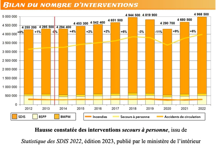 Alors que le secours à personne représente environ 80% des missions des SDIS, le décalage entre leurs missions originelles et les interventions réalisées génère aussi une saturation psychologique des pompiers, abondante dans la littérature spécialisée. Les données ici indiquée ne démontrent pas seulement une perception mais clairement une détérioration objective des conditions de travail.